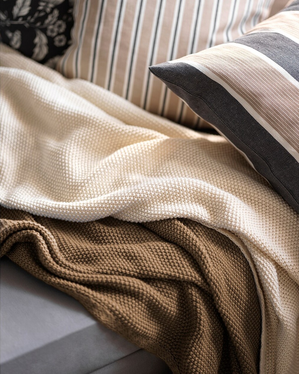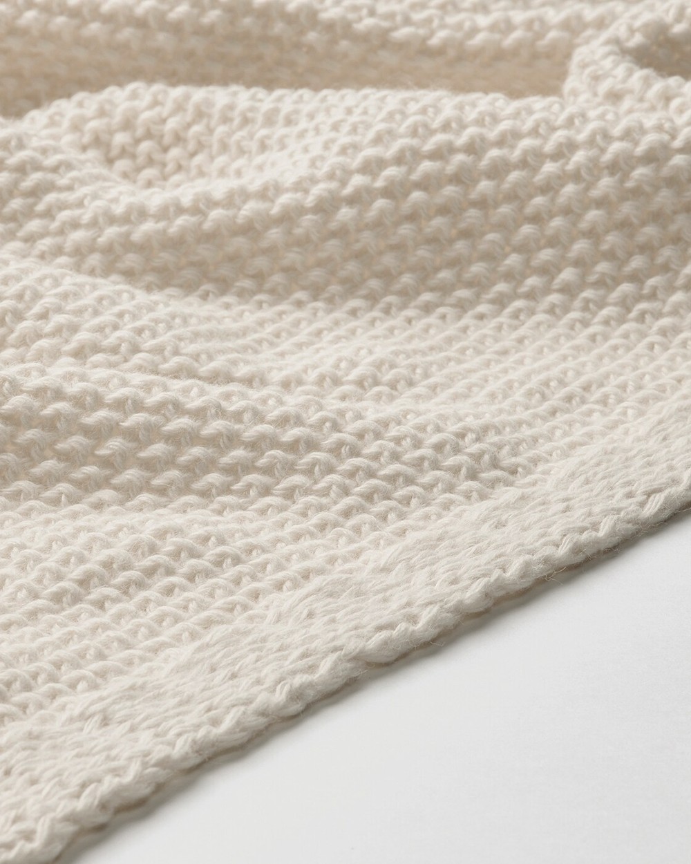 The lounge blanket is designed in beige color to give you a warm and cozy wrap. The fabric is soft to the skin and cozy to the touch. The knitted fabric has a strong and breathable texture and is made of 100% recycled polyester. Woven with a special structure for elasticity and stretch.