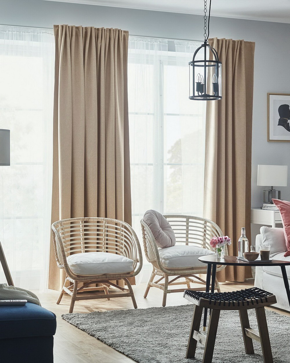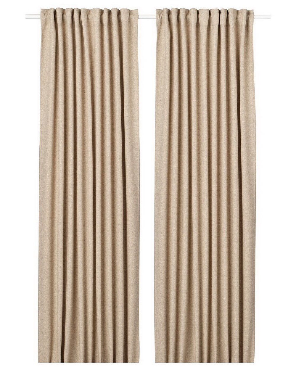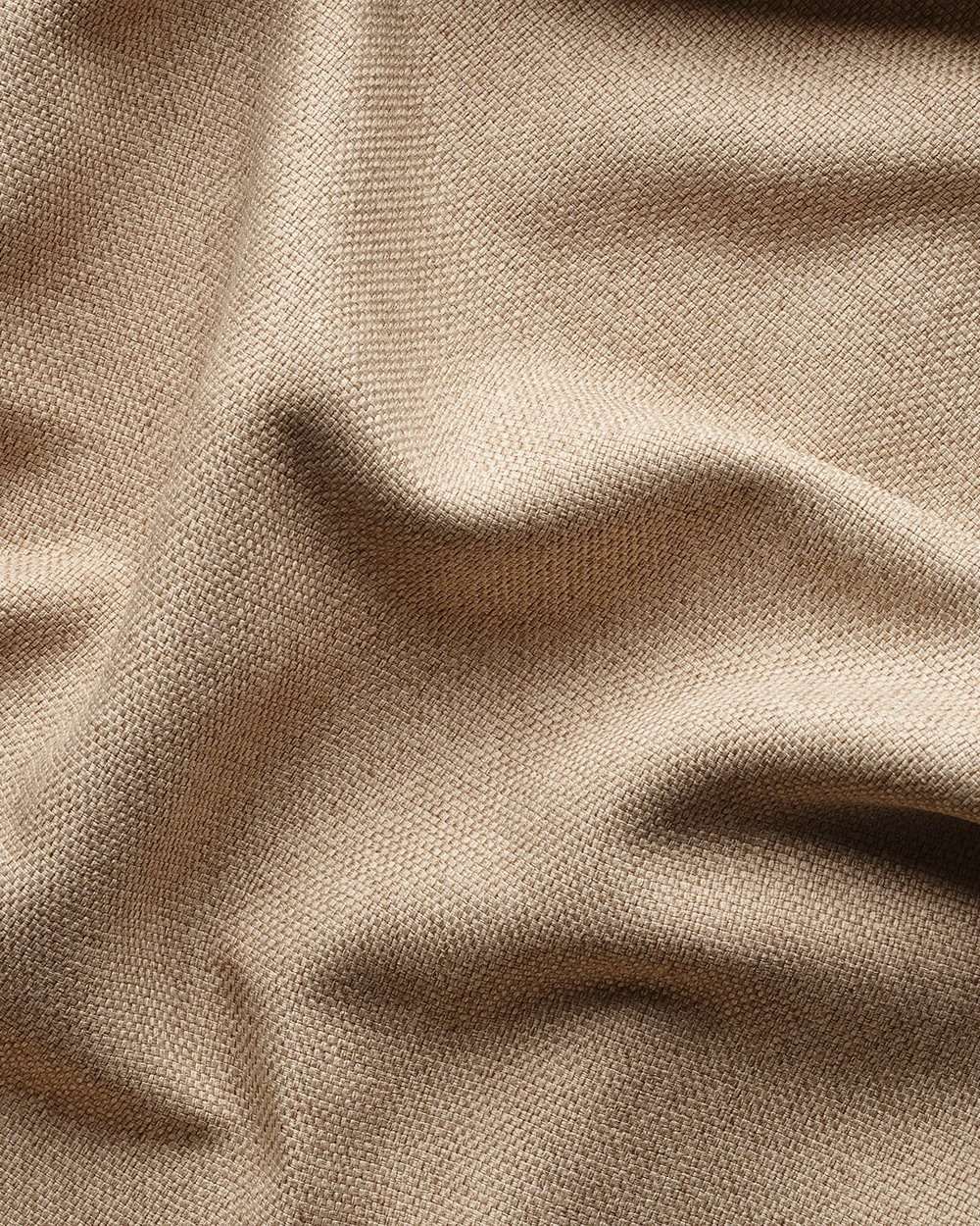 Premium texture with linen-like appearance, featuring a melange effect achieved through cationic yarns blended with regular polyester yarns and a specialized dyeing process for a layered, two-tone visual effect. Featuring a coarse jacquard weave with relatively thick yarns, it delivers a rugged, textured surface. Constructed with a three-layer weaving structure, the middle layer incorporates black yarns for enhanced light-blocking performance. With high density and heavy weight, the fabric offers excellent opacity, a premium texture, soft hand feel, and a beautiful drape.